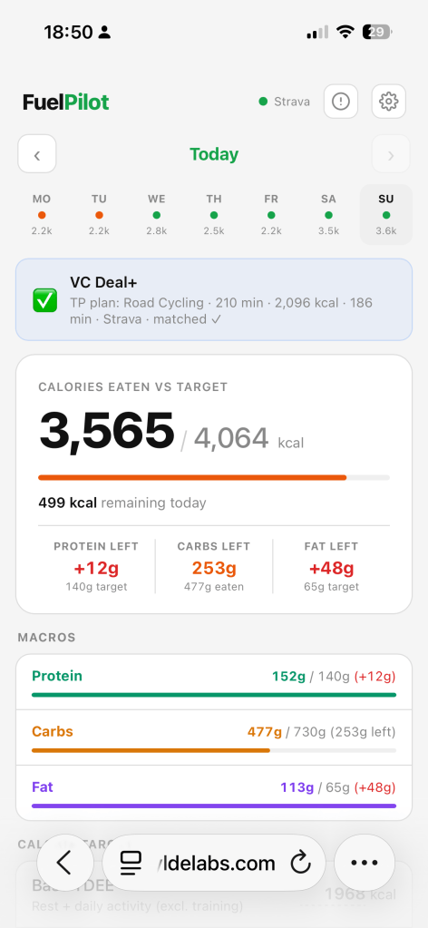 Integration has also been a key part of the design. At the moment, FuelPilot uses my Strava for actual training load and TrainingPeaks calendar data for planned sessions. The logic is intentionally simple: completed workouts take priority, then planned workouts, then none. That gives a daily target based on the best available training signal, rather than trying to be clever in ways that make the system harder to trust.