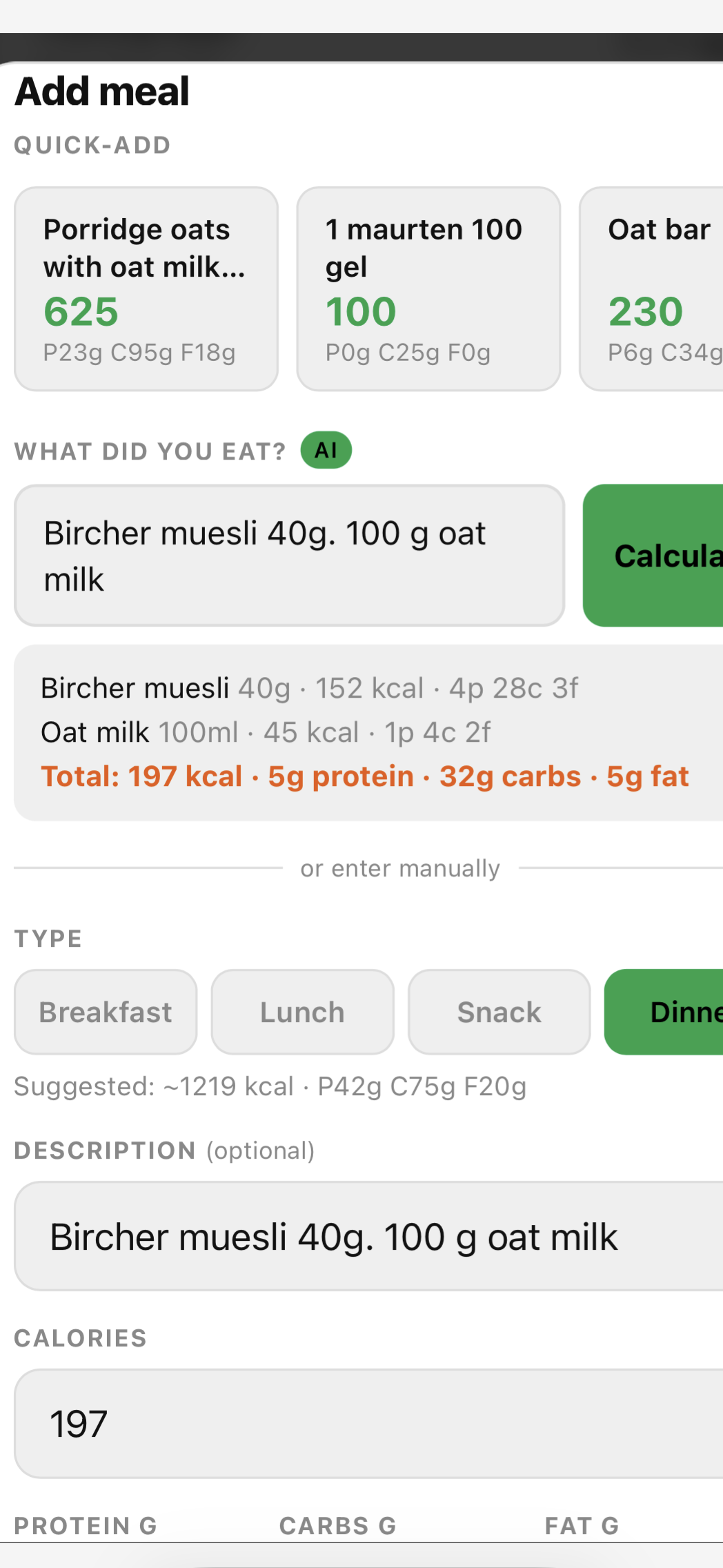 If you care about performance, “how much did I eat?” is only part of the picture. What also matters of course day to day is the relationship between food, training load, recovery, and the choices you make as a result of all these data points. I wanted something that would allow me see that clearly, without disappearing into endless manual admin.